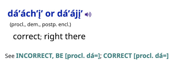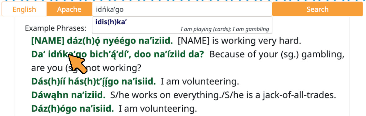 Click on words within an entry to search for those Apache or English words within the dictionary. Hit Enter or Click the result to proceed to the entry.